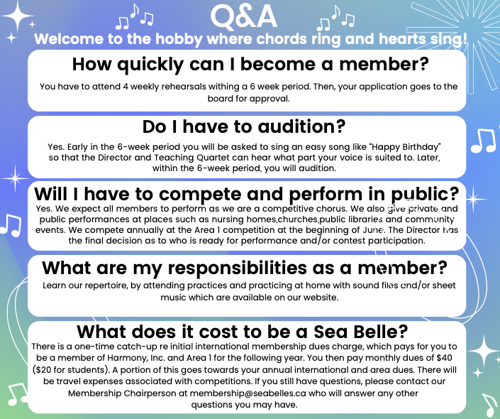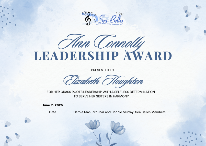 Chartered in 1969, the Sea Belles are a competitive chorus of Harmony Incorporated. Harmony Inc. is an international organization of women, who sing barbershop style music in 4 part a cappella. The Sea Belles welcome energetic women of all ages, who love to sing! We are all about the magic of barbershop music. Our mission is to work hard and have FUN while we do it!